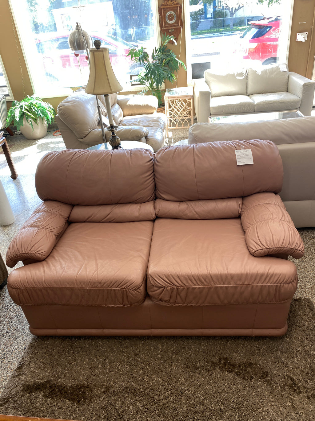 Salmon pink leather loveseat